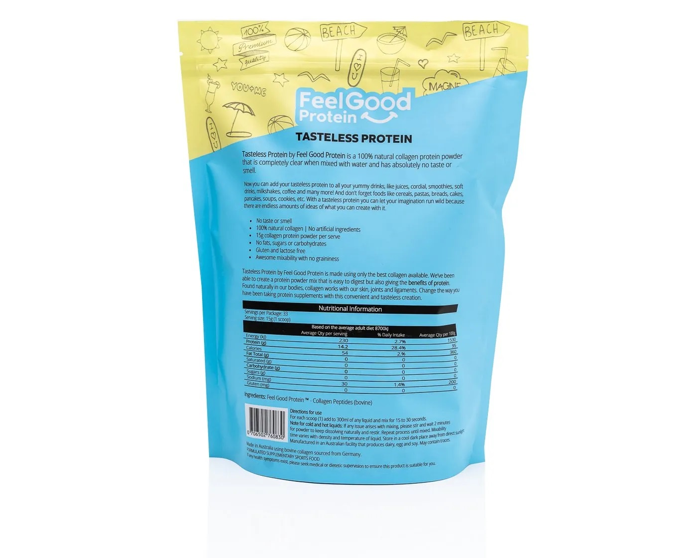 Feel Good Tasteless Protein Collagen Powder is a 100% natural collagen protein powder that is completely clear when mixed with water and has absolutely no texture, taste or smell.